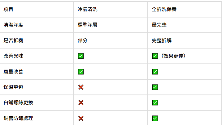 我們提供 冷氣清洗 與 全拆洗保養 兩種專業服務,依冷氣實際狀況評估,給您最適合的處理方式。